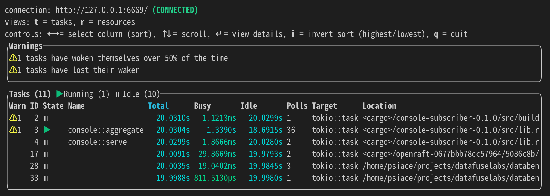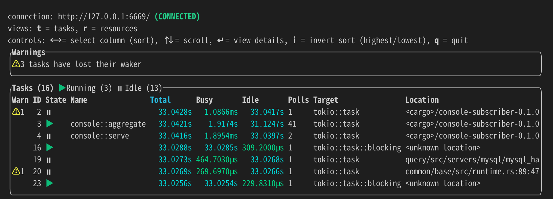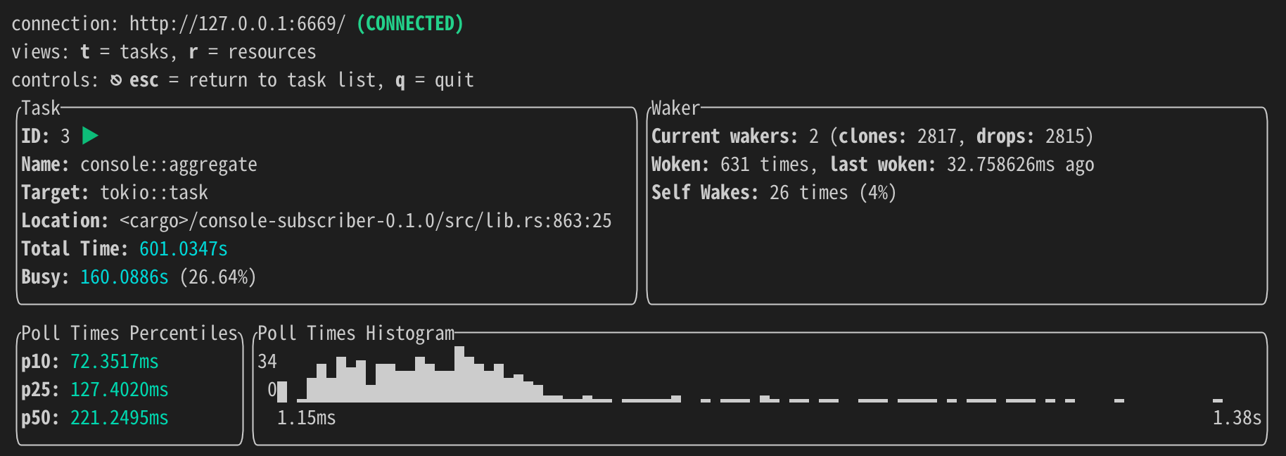 tokio-console.tokio-console # default connection: http://127.0.0.1:6669