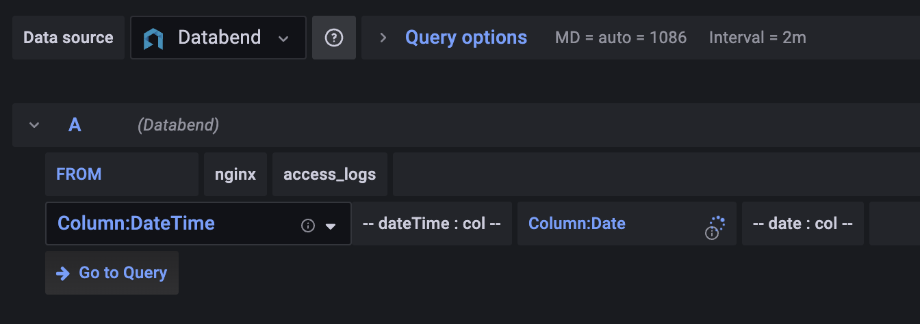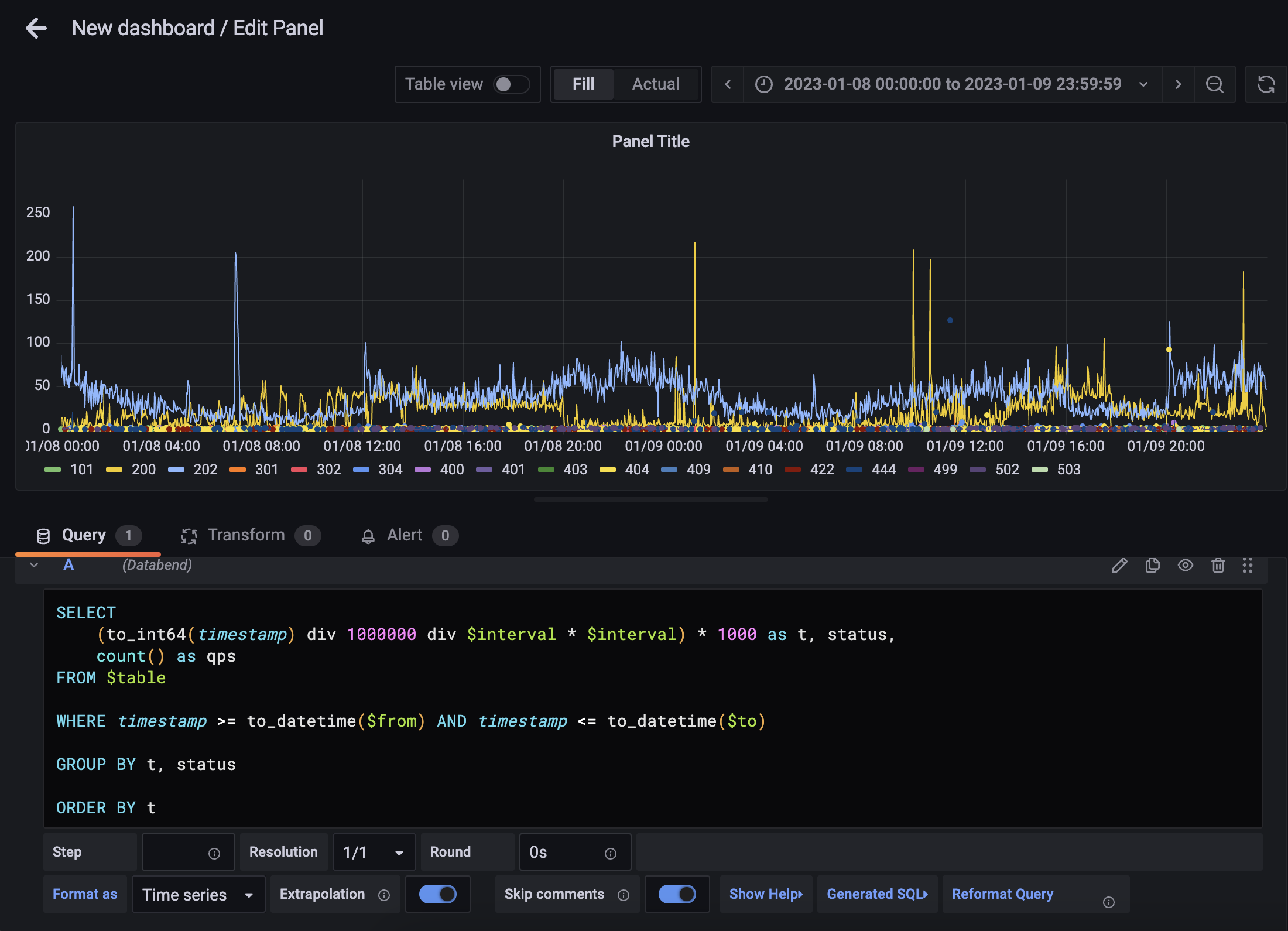 Show Helpfor available macros, some frequenetly used are:$intervalreplaced with selected "Group by time interval" value (as a number of seconds)$tablereplaced with selected table name from Query Builder$fromreplaced with (timestamp with ms)/1000 value of UI selected "Time Range:From"$toreplaced with (timestamp with ms)/1000 value of UI selected "Time Range:To"